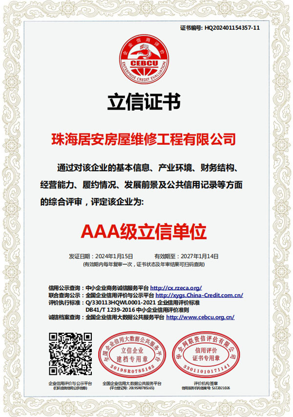 珠海居安房屋維修工程有限公司成立于2020年,是一家專注房屋維修的公司。我們擁有各類型專業(yè)人才,業(yè)務(wù)包括老舊建筑翻新改造、外墻空鼓修復(fù)、防水幕墻養(yǎng)護(hù)、外墻預(yù)置構(gòu)件拆除更換、供排水管網(wǎng)改造、墻面翻新、鋼制結(jié)構(gòu)建筑構(gòu)建及折除,外墻清洗及裝修裝飾。 公司自成立以來,始終堅持以人為本、誠信敬業(yè)的經(jīng)營原則,與多家單位達(dá)成固定維修、養(yǎng)護(hù)清洗協(xié)儀,業(yè)務(wù)遍及廣州、東莞、中山、珠海等多個周邊城市。專業(yè)化團(tuán)隊尤其在墻面及窗邊防水工程業(yè)內(nèi)知名。…… >>> 更多內(nèi)容 |